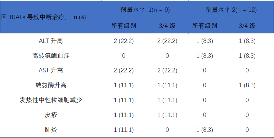 研究结果:截止2021年5月6日,21例患者(DL1共9例;DL2共12例)接受治疗。在DL1组中,最常见的≥3级治疗相关的不良事件为丙氨酸氨基转移酶、天冬氨酸氨基转移酶、中性粒细胞降低、白细胞计数降低(各2例,22.2%),在DL2组中最常见的≥3级治疗相关的不良事件为中性粒细胞计数降低(n=5,41.7%)。因治疗相关不良事件中断治疗的患者DL1组5例、DL 2组4例,主要是≥3级肝功能异常。这项研究在安全性预试验结束后(2021年7月27日)关闭。其他安全性和初步疗效数据(数据库锁定:2022年2月3日)见下表。