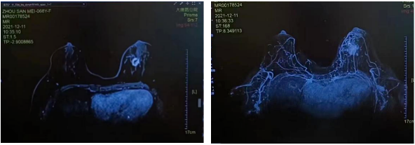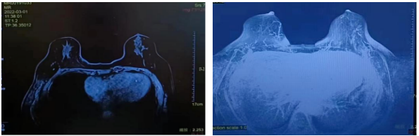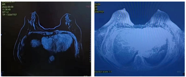 乳腺MR:左乳内侧肿块(内侧象限,9点钟,距乳头3.6cm),2.2×1.4cm,左腋下淋巴结肿大(2.2×2.1cm),考虑乳腺癌;乳腺BI-RADs分级5类。