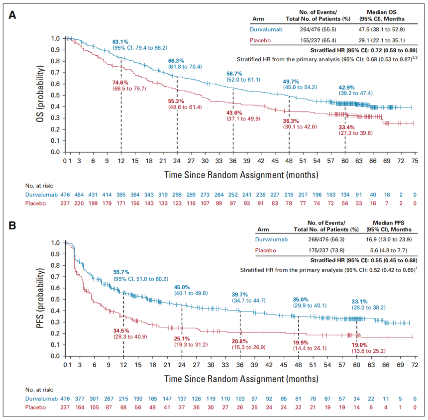 图1.PACIFIC研究更新OS(A)和PFS(B)