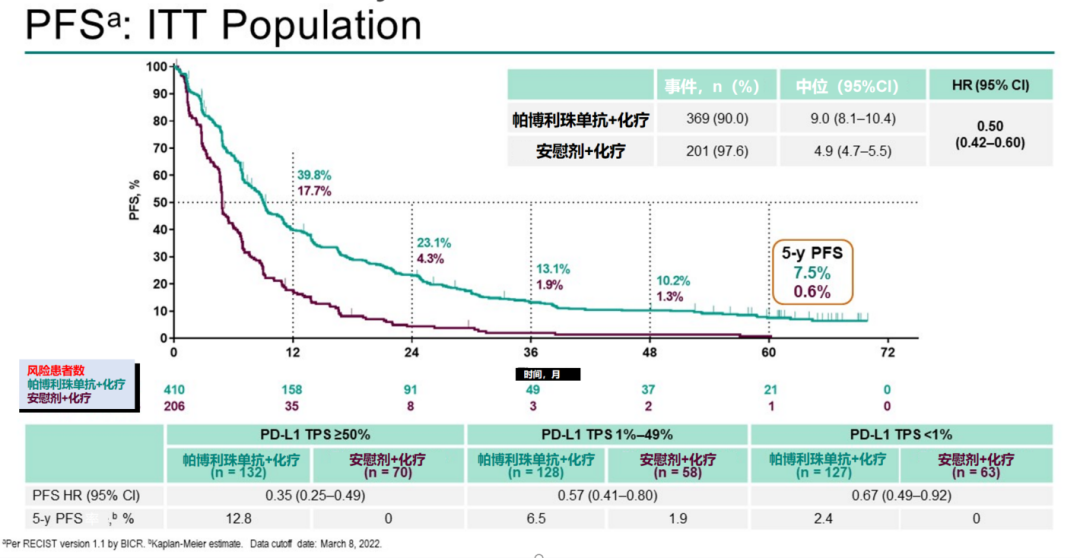 2022年欧洲肿瘤内科学会年会(ESMO 2022)公布了Keynote189研究5年随访数据,帕博利珠单抗+化疗组和安慰剂+化疗组5年OS率分别为19.4%和11.3%,5年PFS率分别为7.5%和0.6%,展示出了免疫治疗的长期获益(图2,图3)。