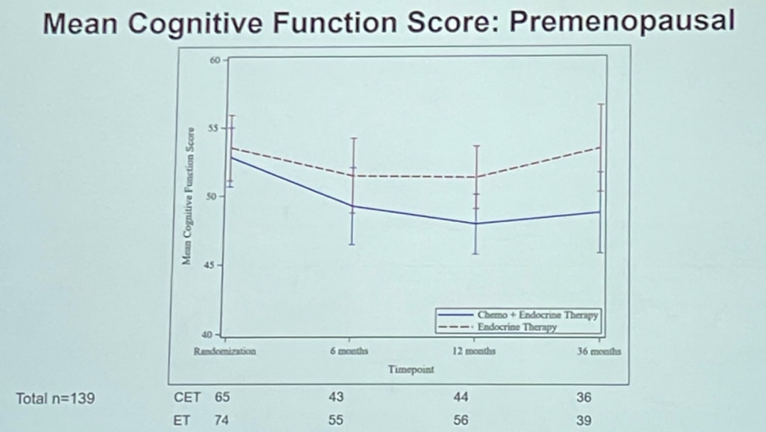 在这项子研究中,参与者完成了一份李克特五点计分调查表中的8项问卷,以评估基线、6个月、12个月和36个月的认知功能。RxPONDER PRO子研究的主要终点是治疗组的平均认知功能评分和绝经状态。其中,139名女性为绝经前(中位年龄48岁)患者,429名女性为绝经后(中位年龄62岁)患者。