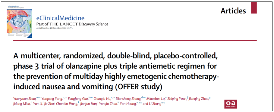 12月15日,中山大学肿瘤防治中心内科张力教授领导的团队在《柳叶刀》子刊eClinicalMedicine(影响因子=17.033)在线发表了题为“奥氮平联合三联止吐方案预防高致吐药物多日化疗引起恶心、呕吐的多中心、双盲随机对照3期临床研究”的文章