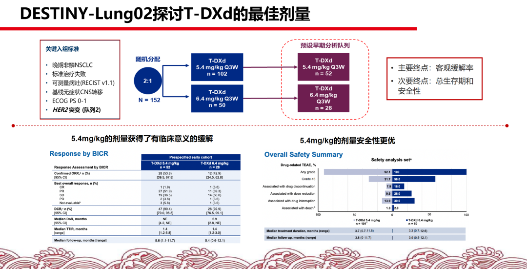 DESTINY-Lung02则是T-DXd的另一项国际多中心、2期研究,入组患者与DESTINY-Lung01研究相似,但进一步优化了T-DXd的给药方案,患者随机(2:1)接受6.4mg/kg或5.4mg/kg的T-DXd,以验证T-DXd低剂量方案的疗效和安全性。2022年ESMO大会报道的研究结果显示,6.4mg/kg组和5.4mg/kg组的ORR分别为42.9%和53.8%,≥3级TRAE发生率分别为58.0%和31.7%[9](点击查看更多)。该研究进一步证实了低剂量T-DXd(5.4mg/kg)相较于高剂量更加高效、低毒。FDA基于DESTINY-Lung02研究结果,批准了T-DXd(5.4mg/kg)用于既往接受过全身治疗、HER2突变的不可切除或转移性NSCLC成人患者。