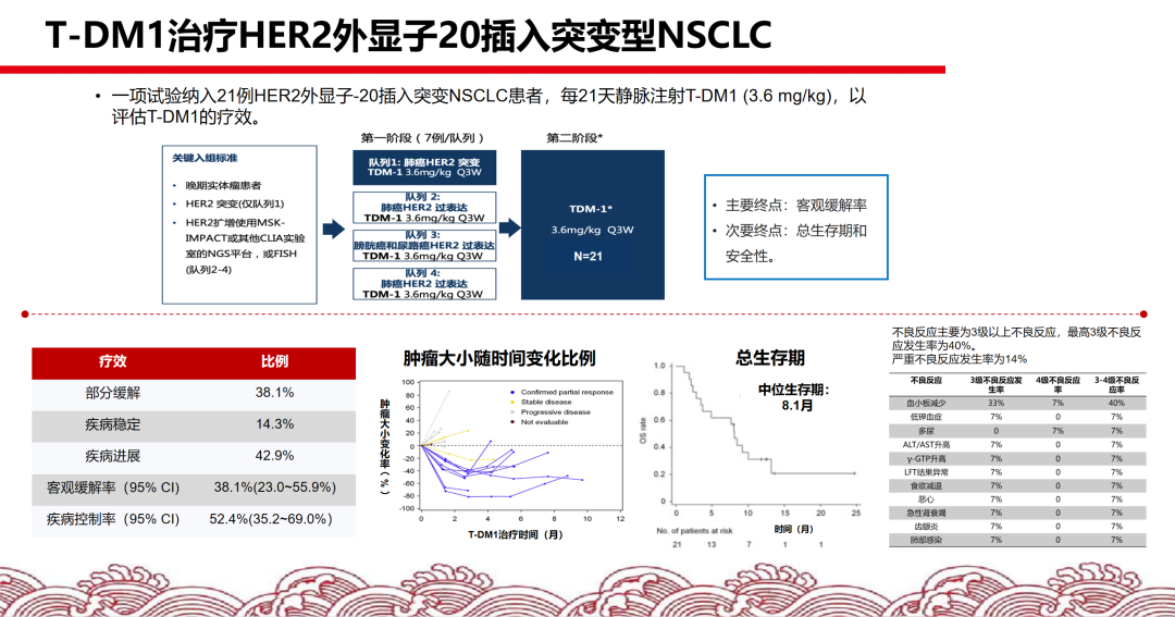 T-DM1(Trastuzumab Emtansine)是第一个应用于实体瘤治疗的ADC,由曲妥珠单抗、DM1(美登素衍生物)通过不可裂解的硫醚连接子偶联而成,DAR为3.5。2022年发表于《欧洲癌症杂志》(Eur J Cancer)的一项2期研究,T-DM1用于20例既往经1-2线治疗的HER2变异晚期NSCLC(其中19例为HER2外显子20插入突变型),ORR和疾病控制率(DCR)分别为38.1%和52.4%,中位PFS和OS分别为2.8个月和8.1个月,≥3级TRAE发生率为31.8%[10]。T-DM1未被FDA批准肺癌的适应症,未开展3期临床研究,NCCN指南仅将T-DM1作为HER2突变后线的治疗的其他推荐。