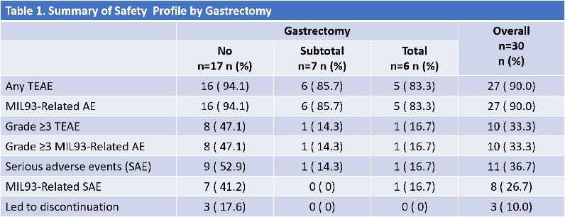 截至2022-12-15,27例患者(90%)出现至少一次治疗期不良事件(TEAE)。考虑到Claudin18.2在胃中的器官特异性表达,这些事件的发生频率与有无进行胃切除术密切相关。未进行胃切除术的患者出现更严重的不良事件(表1)。常见(≥20%)TEAE为恶心、呕吐、低白蛋白血症、贫血、食欲下降、低钠血症、天冬氨酸氨基转移酶升高、乏力、低钙血症、便秘。在≥20mg/kg剂量的14例G/GEJAC患者中,2例患者达到客观缓解,疾病控制率(DCR)达42.8%。