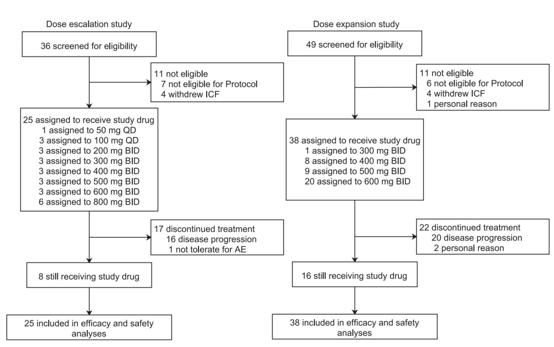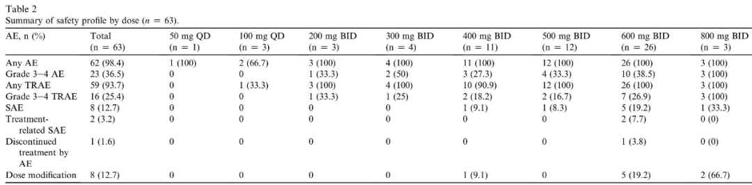 98.4%的患者出现全因任何级别不良反应,93.4%的不良反应考虑与治疗有关;3度及以上全因不良反应发生率为36.5%,其中,25.4%的不良反应考虑与治疗有关。无5级不良反应出现,最常见的治疗相关不良反应包括腹泻(任何级别82.5%;3度以上6.4%),恶心(82.5%,3.2%),呕吐(71.4%,3.2%),12.7%的患者因治疗相关的不良反应需要剂量修改。在剂量爬坡阶段,6例接受600 mg每日两次治疗的患者,出现1例剂量限制性毒性;3例接受800 mg,每日两次治疗的患者,出现1例剂量限制性毒性,800 mg每日两次剂量爬坡结束后,研究者决定不再进行额外的患者招募,因此研究未达到最大耐受剂量,后续推荐给药剂量为600 mg,口服,每日两次。