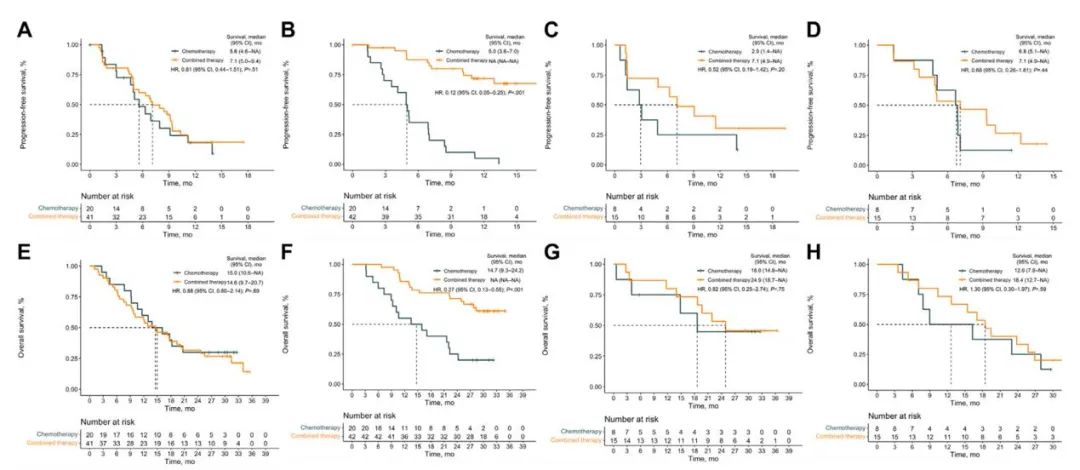 在TIME的四个亚型中分别比较联合治疗和化疗,只有在亚型II中(具有高免疫评分和高PD-L1 mRNA表达),PFS(HR,0.12;95%CI,0.06-0.25;P<.001)和OS(HR,0.27;95%CI,0.13-0.55;P<.001)的改善才有统计学意义(Figure 3B,C)。