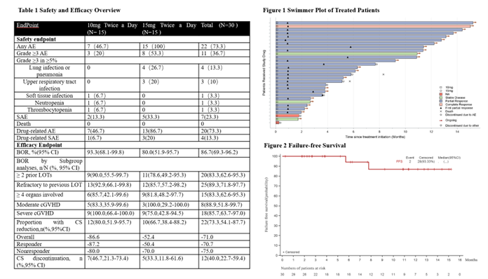 截止2022年9月30日,共入组了30例患者,中位年龄34岁(16~59),其中53.3%为男性,所有入组的患者在既往平均接受过3次cGVHD的相关治疗,其中12例既往接受过芦可替尼治疗,70%为重度cGVHD。入组的患者分别接受TQ05105 10mg BID(n=15)和15mg BID(n=15)治疗,其中10mg BID组有47%患者的cGVHD累及≧4个器官,而15mg BID组则有73%患者的cGVHD累及≧4个器官。