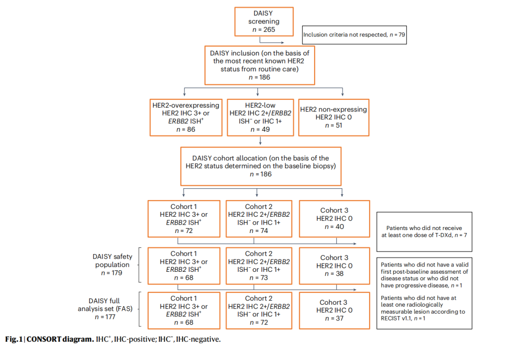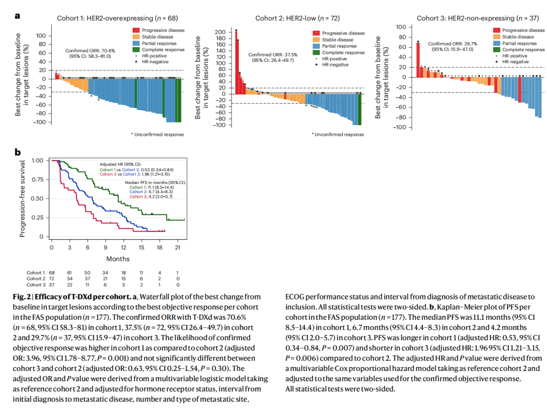 Ⅱ期DAISY研究评估了T-DXd在HER2过表达(IHC3+或IHC 2+/ISH+,n=72,队列1)、HER2低表达(IHC2+/ISH-或IHC1+,n=74,队列2)和HER2不表达(IHC0+,n=40,队列3)mBC患者中的疗效[9]。DAISY研究共筛选265例患者,并根据已知的最新HER2状态进行调整,最终共186例患者入组试验。患者接受T-DXd静脉注射5.4 mg/kg,每3周1次,直至疾病进展或出现研究者定义的不可接受的毒性。主要终点是研究者使用RECIST 1.1评估的确认的客观缓解率(ORR)。次要终点包括缓解持续时间(DOR)、PFS、总生存期(OS)、临床获益率和安全性。