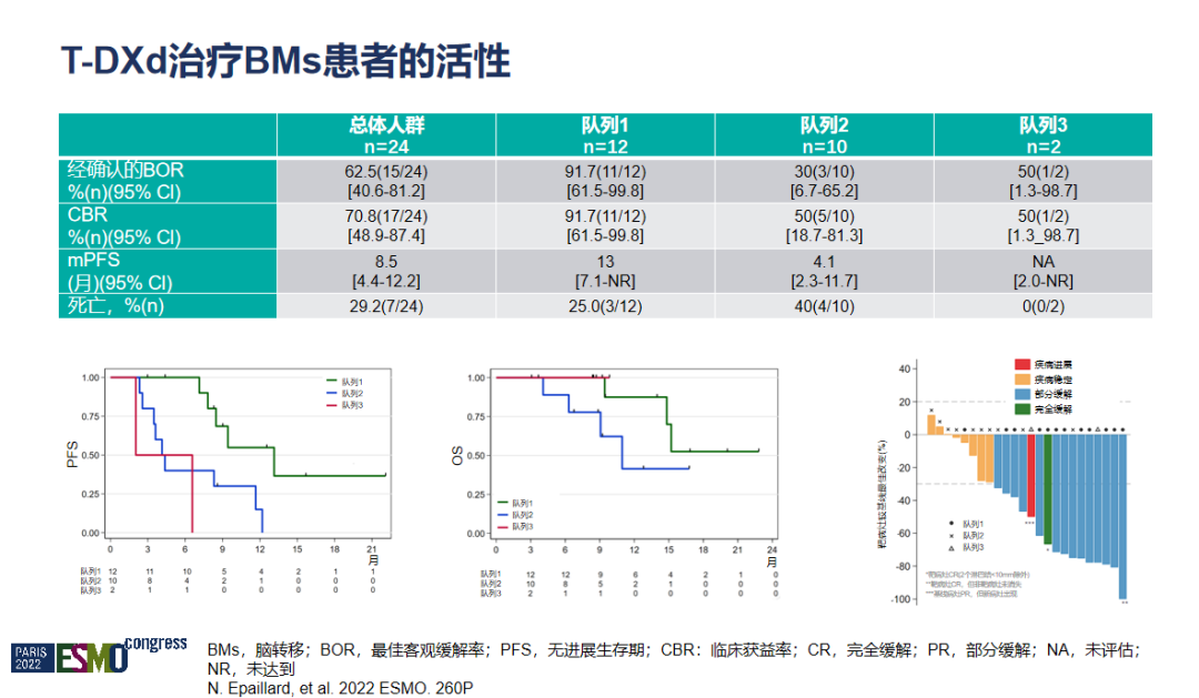 DAISY研究共入组了24例脑转移晚期乳腺癌患者(队列1:12例,队列2:10例,队列3:2例)。总人群中经确认的最佳客观缓解率(BOR)为62.5%(15/24),队列1/2/3经确认的BOR分别为91.7%(11/12)、30%(3/10)和50%(1/2)。总人群的CBR为70.8%,队列1/2/3的CBR分别为91.7%(11/12)、50%(5/10)和50%(1/2)。总人群和队列1/2/3的中位PFS分别为8.5个月、13个月、41个月和NA。