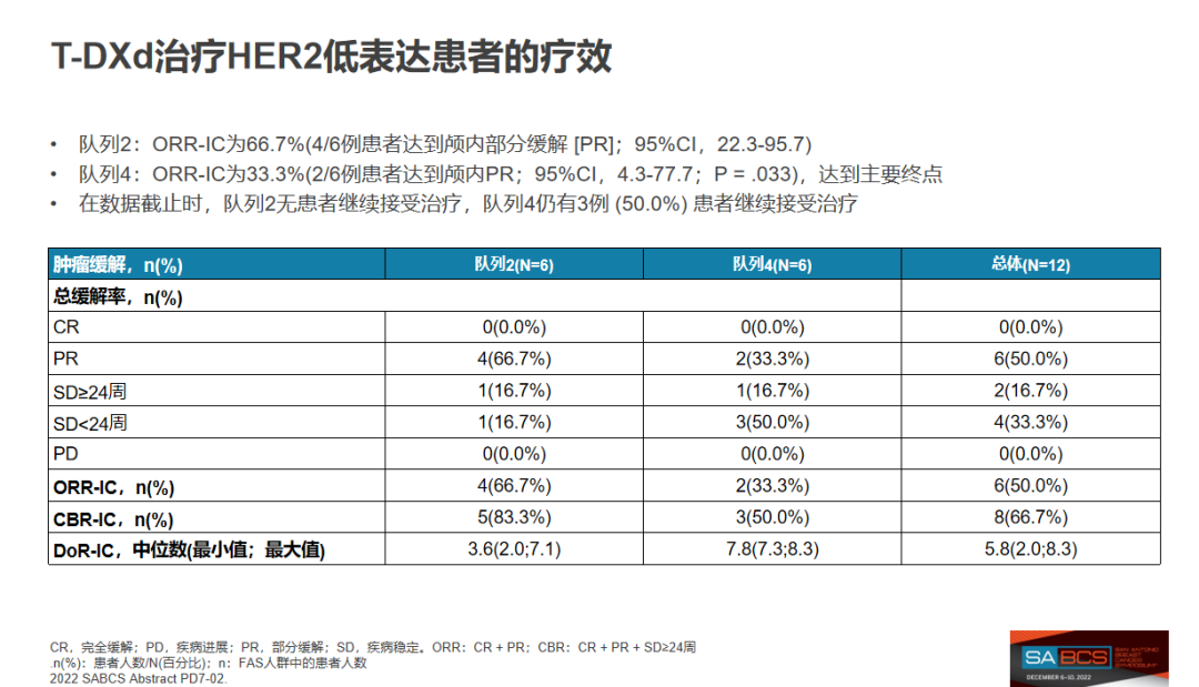 DEBBRAH研究旨在评价T-DXd在伴脑转移和/或软脑膜癌(LMC)的HER2阳性和HER2低表达晚期乳腺癌患者的疗效和安全性[11]。2021年SABCS大会上,已公布队列1和队列3的HER2阳性脑转移疗效;2022年SABCS公布上,队列2和队列4 HER2低表达脑转移患者的疗效公布,其中队列2为未经治疗无症状脑转移患者(6例),队列4为脑部局部治疗后疾病进展的脑转移患者(6例)。主要终点为队列2和4根据RANO-BM评估颅内总缓解率(ORR-IC),次要终点包括队列2和4根据RANO-BM评估中枢神经系统无进展生存期(CNS-PFS)、临床获益率(CBR-IC)、至缓解时间(TTR-IC)、DOR、12周IC稳定率和肿瘤负荷变化的最佳百分比、根据NCI-CTCAE v.5.0评估安全性等。