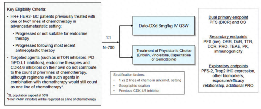 TROPION-Breast01是一项全球、随机、多中心、开放标签的3期临床试验,旨在评估Dato-DXd对比研究者选择的单药化疗(TPC,艾立布林、卡培他滨、长春瑞滨或吉西他滨)用于HR阳性、HER2低表达或阴性(IHC 1+或IHC 2+/ISH-,IHC 0)不可手术或转移性乳腺癌患者的安全性和有效性。这些患者既往接受过内分泌治疗,且至少接受过一次全身治疗。研究的主要终点是盲法独立中心审查(BICR)的无进展生存期(PFS)和总生存期(OS),关键次要终点包括客观缓解率(ORR)、缓解持续时间(DoR)、研究者评估的PFS、疾病控制率(DCR)和至首次后续治疗时间。
