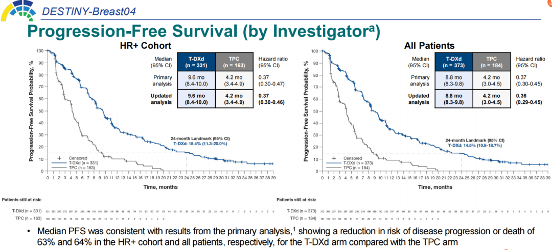 中位PFS数据显示,在HR阳性患者中,T-DXd vs TPC组:9.6个月(95%CI:8.4~10.0)vs 4.2个月(95%CI:3.4~4.9)(HR 0.37,95%CI:0.30~0.46),降低疾病进展或死亡风险达63%。所有患者中,T-DXd vs TPC组:8.8个月(95%CI:8.3~9.8)vs 4.2个月(95%CI:3.0~4.5)(HR 0.36,95%CI:0.29~0.45),降低疾病进展或死亡风险达64%。