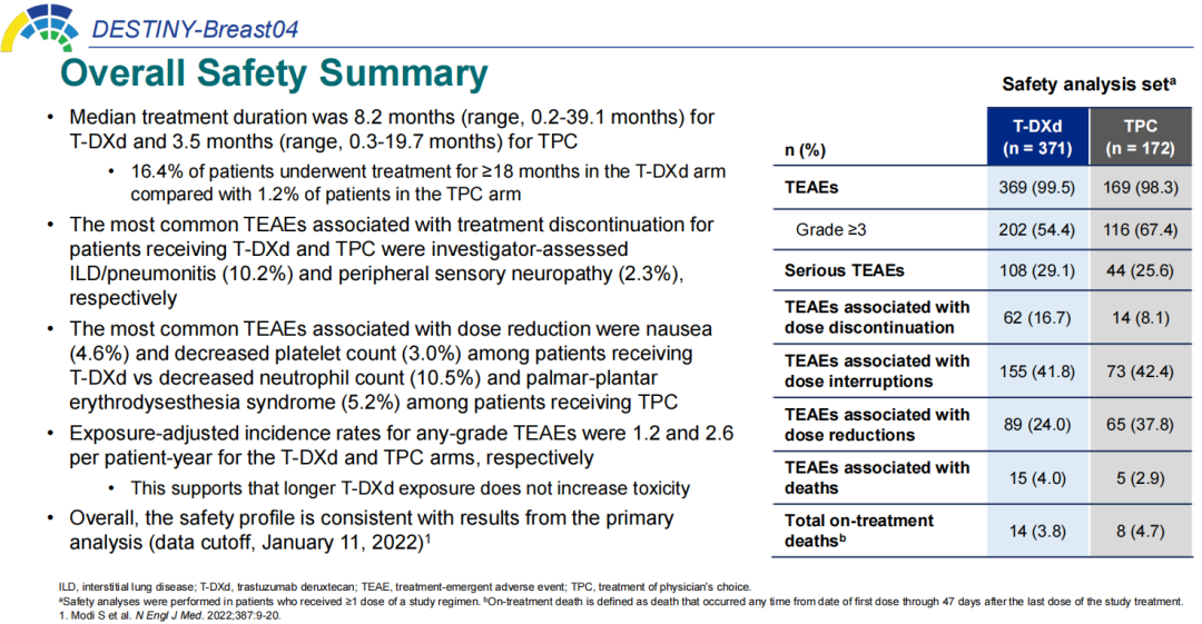 安全性数据显示,T-DXd组≥3级治疗相关不良事件(TEAEs)较TPC组更低(54.4%vs 67.4%)。T-DXd和TPC组中任何级别TEAEs的暴露校正发生率(EAIRs)分别为1.2和2.6。随着随访时间的延长,未报道新的药物引起的肺间质疾病/肺炎事件[初次DCO:T-DXd:45例(12.1%);TPC:1例(0.6%)]。