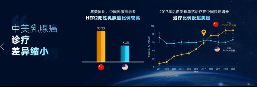“女人是天,男人是地。女人好,男人才有可能顶天立地。”聚光灯下,江泽飞教授缓缓步入舞台中央,在他无奈又遗憾的声音中,映入眼帘的,是一片触目惊心的数据——全球每年有226.1万女性罹患乳腺癌,在中国每年也有41.6万例新发乳腺癌患者。乳腺癌已然成为威胁女性健康的首位恶性肿瘤。作为军人,江泽飞教授充满坚定,“人民至上、生命至上”是党中央的号召;作为医生,他深感肩上义不容辞的责任,《健康中国2030规划纲要》明确要求,到2030年,要实现全人群,全生命周期的慢性病健康管理,将我国整体癌症的五年生存率提升15%,乳腺癌的5年生存率提高至80%~90%。我们已经踏上了实现乳腺癌治愈的道路,在HER2阳性乳腺癌领域,循着抗HER2前行的方向,“愈她”不再遥远。