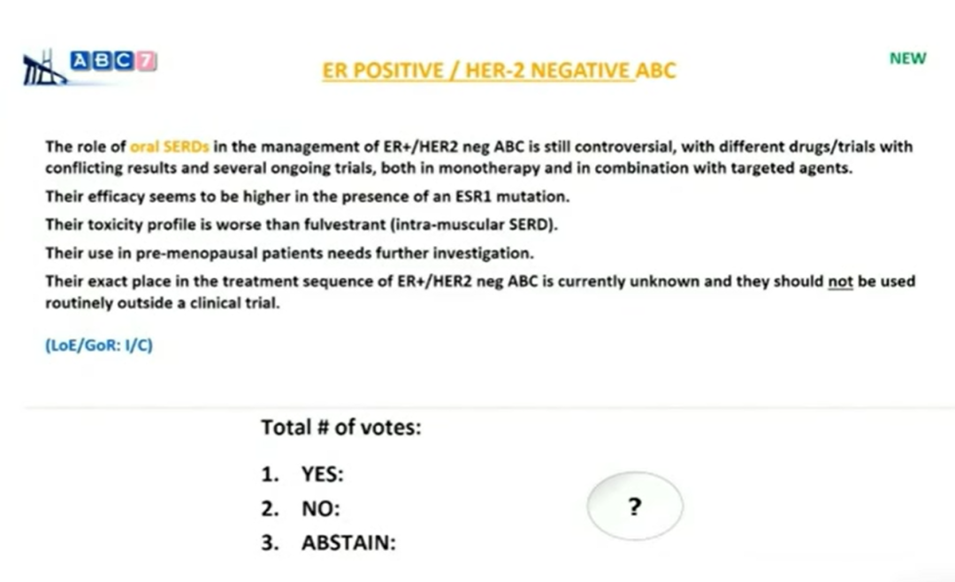 口服SERD在治疗ER+/HER2-ABC中的作用仍然存在争议,一些正在进行的试验无论是单药治疗还是与靶向药物联合治疗,不同的药物/试验的结果相互矛盾,在存在ESR1突变的情况下,口服SERD的效果似乎更高,且毒性比氟维司群更差(肌内SERD),在绝经前患者中的应用需要进一步研究。在ER+/HER2-ABC治疗序列中的确切位置目前尚不清楚,除临床试验外不应常规使用。(LOE/GoR:I/C)