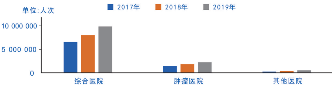 图1.2017年-2019年全国不同类型三级公立医院收治肿瘤住院患者人次分布