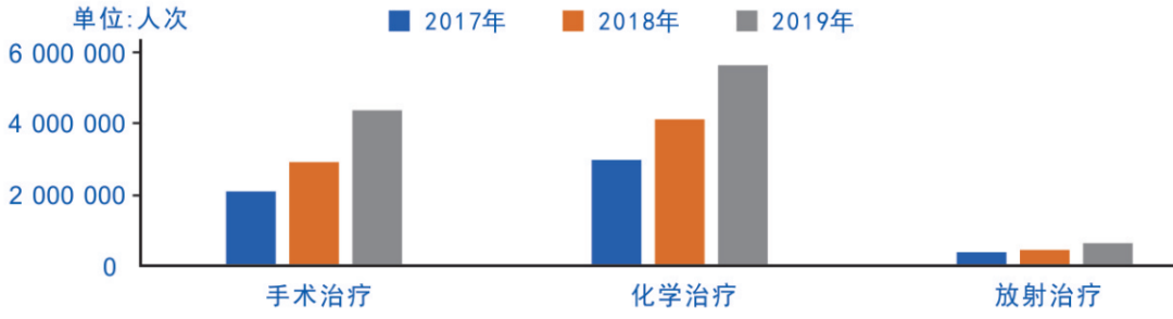 图2.2017年-2019年全国三级公立医院肿瘤住院患者常见治疗方式人次分布