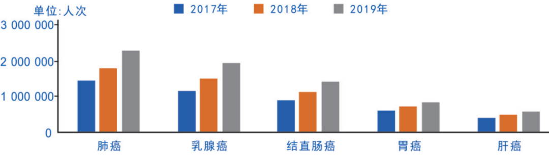 图3.2017年-2019年全国三级公立医院肿瘤住院患者常见癌种人次分布
