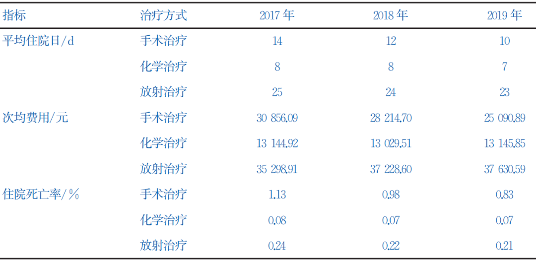 表1.2017年-2019年全国三级公立医院肿瘤住院患者常见治疗方式医疗服务与质量安全情况