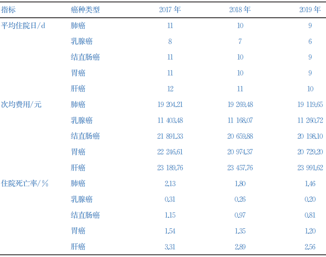 表2.2017年-2019年全国三级公立医院肿瘤住院患者常见癌种医疗服务与质量安全情况