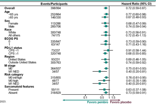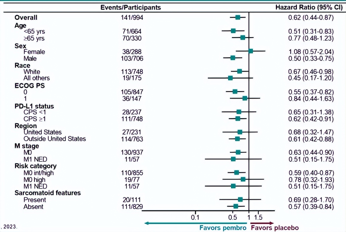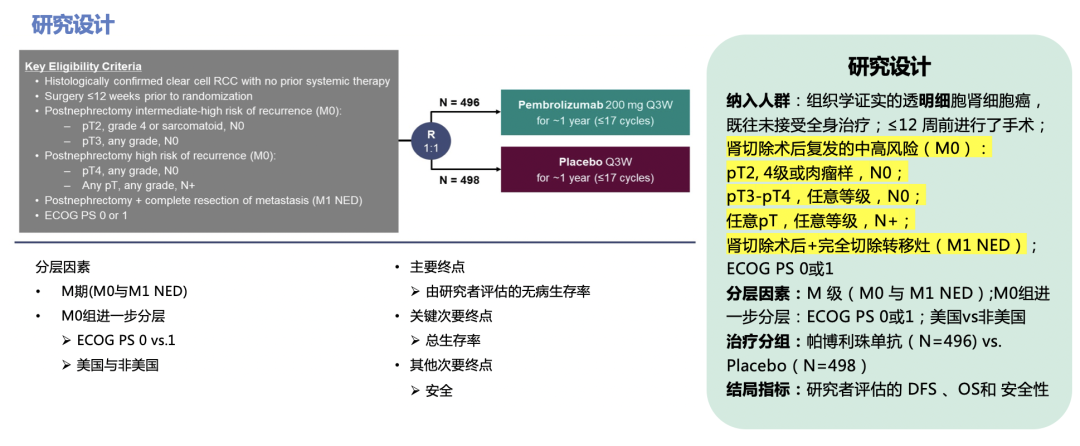 值得一提的是本研究纳入的均为术后有中高复发风险的患者:pT2,4级或肉瘤样,N0M0;pT3-pT4,任意等级,N0M0;任意pT,任意等级,N+M0;或肾切除术后+完全切除转移灶(M1 NED);且既往未接受肾细胞癌(RCC)全身治疗。研究共入组994例患者,按1:1的比例被随机分配接受每3周一次的静脉注射200 mg帕博利珠单抗或安慰剂,持续≥17个周期(约1年)或直至疾病复发、无法耐受的毒性或撤回同意。经研究者评估的DFS为主要研究终点。