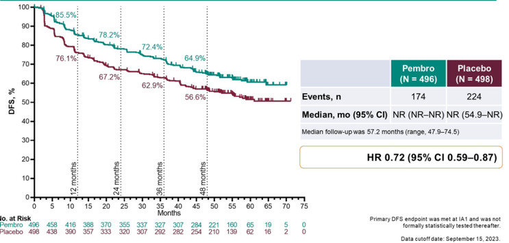 经过中位57.2个月的随访分析,尽管OS数据仍然未成熟,但是帕博丽珠单抗术后辅助治疗高危复发肾癌相较于安慰剂组已经展现出OS获益趋势,mOS NR vs.NR,95%CI 0.44-0.87,HR=0.62,P=0.002;在对既往已经公布的DFS数据进行进一步跟踪随访后发现,DFS数据继续保持稳定,mPFS NR vs.NR,95%CI 0.59-0.87,HR=0.72。