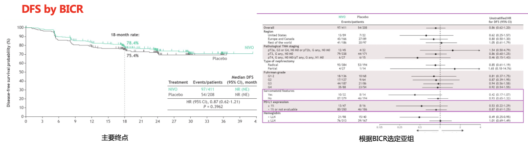 研究入组均为M0患者,病理分期T2a(3/4级)N0M0,T2b~T4N0M0,或者任何TN1M0。主要研究终点是独立中心评价(BICR)的DFS。次要研究终点为OS和安全性。共619例患者随机分配到NIVO单药组(n=411)或PBO组(n=208)。中位随访27.0个月,NIVO单药治疗对比安慰剂的DFS无显著差异(HR,0.87;95%CI,0.62~1.21;P=0.3962)。中位DFS期均未达到;12个月DFS分别为83.3%vs 78.2%、18个月DFS 78.4%vs 75.4%。