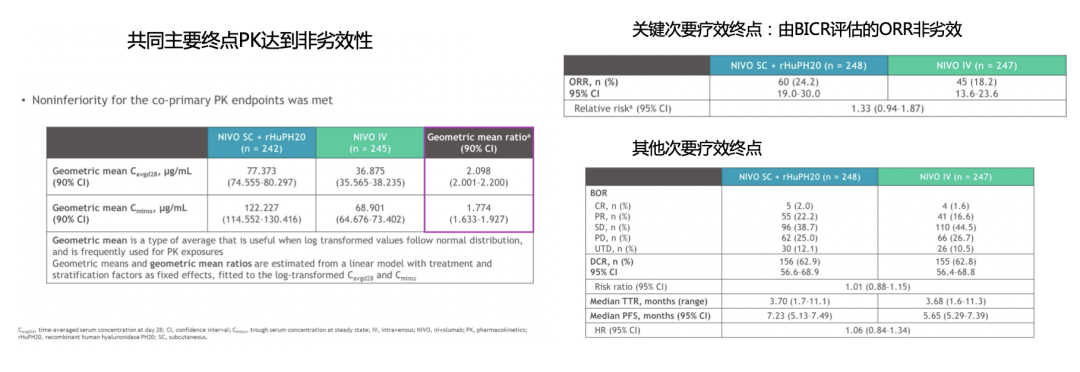 共有495例患者被随机分配到NIVO SC组(n=248)或NIVO IV组(n=247)。SC/IV组的中位年龄为64/66岁。大部分患者为男性。NIVO SC平均注射时间为5分钟。结果显示,在主要结局指标PK上,皮下注射和静脉给药之间无显著差异;在次要研究终点上,皮下注射和静脉给药的ORR分别为24.2%vs 18.2%,其中CR率2.0%vs 1.6%,PR率22.2%vs 16.6%,DCR率62.9%vs 62.7%,两组之间没有显著差异,主要终点和次要终点均满足非劣效性。