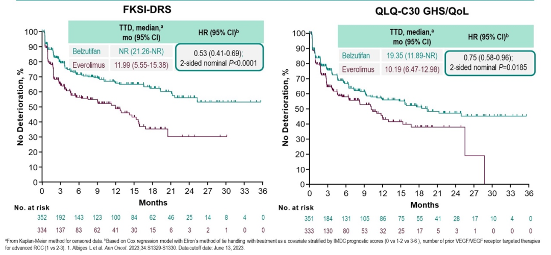 LITESPARK-005研究报告了基线到第17周的生活质量评分得分,生活质量恶化定义为FKSI-DRS降低≥3分或EORTC QLQ-C30评分降低≥10分。截至2023年6月13日(第二次预先指定的中期分析的数据截止日期),中位随访时间为25.7个月。中位治疗时间为贝组替凡7.6个月,依维莫司3.9个月;两组分别有84(22.6%)例和18(5.0%)例患者正在接受治疗。贝组替凡组的374例受试者中的366例和依维莫司组的372例受试者中的354例被纳入PRO分析人群。FKSI-DRS和QLQ-C30每组的完成率在基线>90%,在第17周(~4个月)>55%。