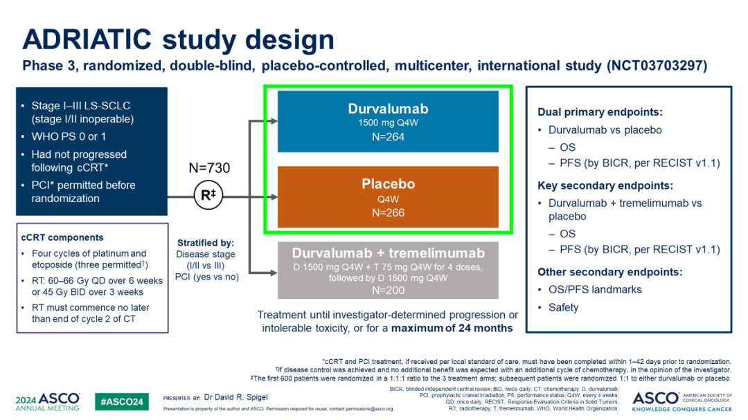 ADRIATIC旨在评估度伐利尤单抗(durvalumab)作为LS-SCLC同步放化疗后巩固疗法的作用,这是第一项在此类患者中探索免疫疗法作用的III期研究。受试者均患有I-III期局限期小细胞肺癌,体能状态良好,所有患者在随机分组前均接受了同期放化疗。预防性颅脑照射(PCI)的使用由研究者自行决定。双重主要终点是度伐利尤单抗组对比安慰剂组的总生存(OS)和无进展生存(PFS)。