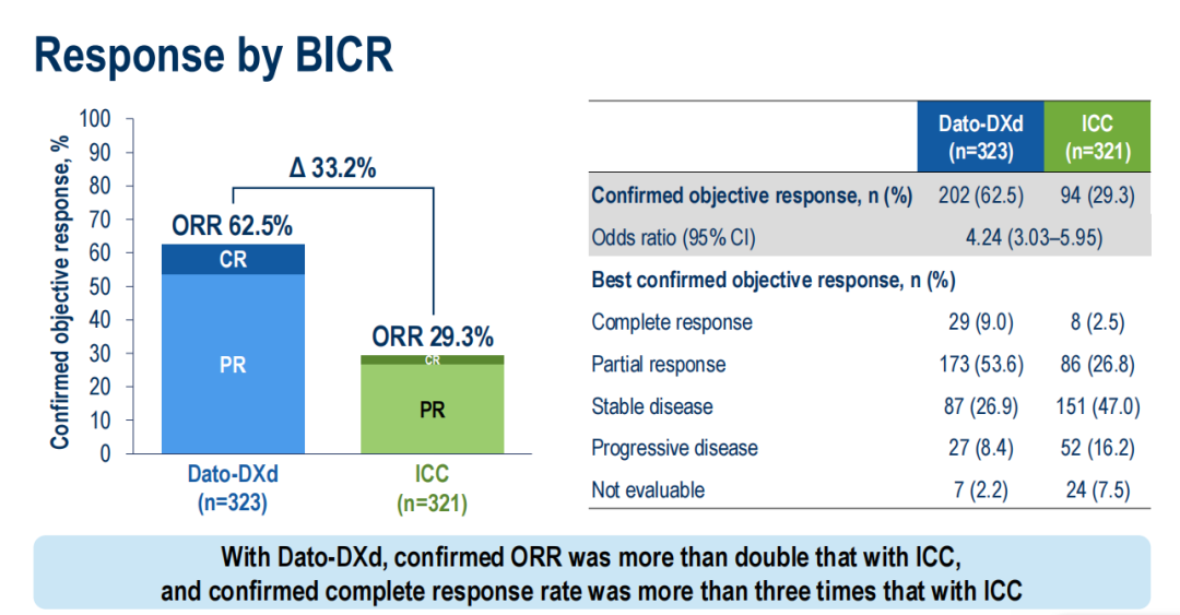 此外,Dato-DXd在缓解率和缓解持续时间上也显著优于化疗组。Dato-DXd组经证实的ORR是ICC组的2倍以上(62.5%vs29.3%),经证实的完全缓解率是ICC组的3倍以上(9.0%vs 2.5%)此外,Dato-DXd组中位DoR达12.3个月,远超化疗组的7.1个月。这些数据表明,Dato-DXd不仅起效快且疗效持久。